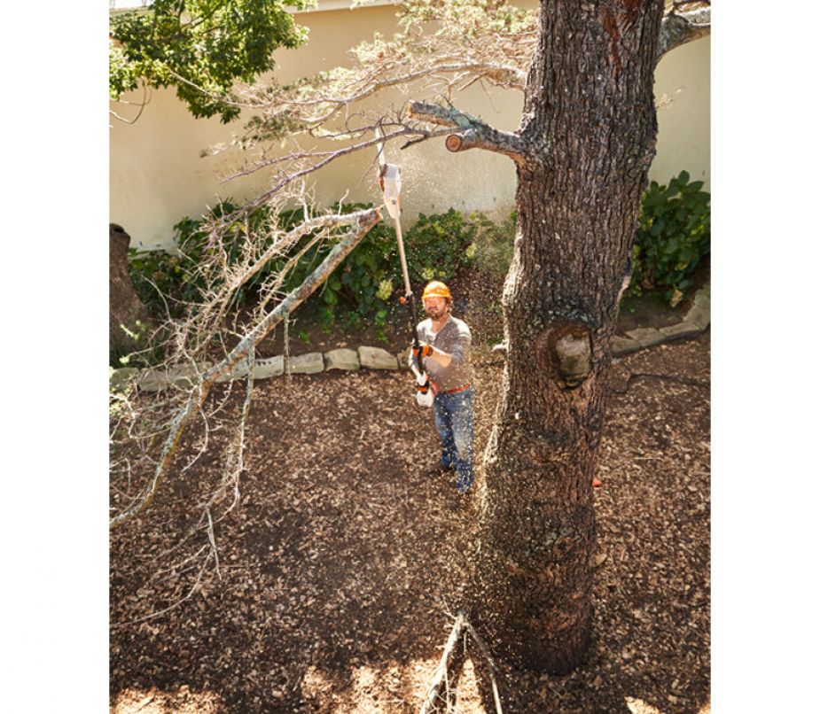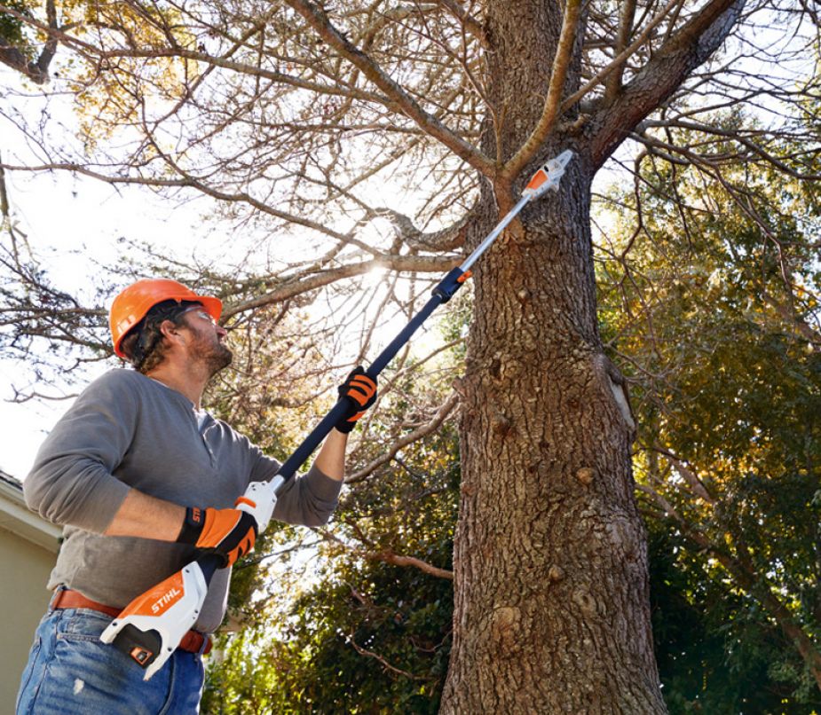 Leichter Akku-Hoch-Entaster mit hoher Schnittleistung für Baumpflegearbeiten jeglicher Art. 1/4"-PM3-Sägekette und seitliche Kettenspannung.